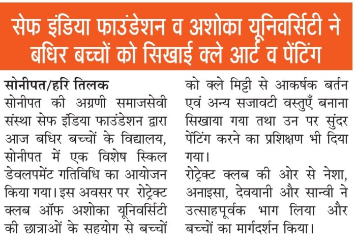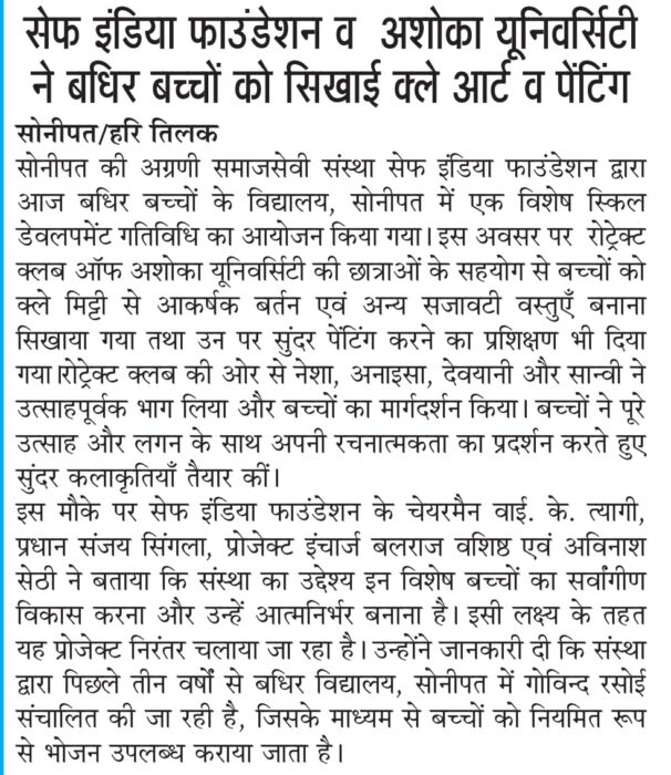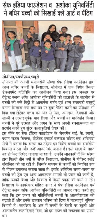 07/02/26 को बधिर स्कूल सोनीपत में सेफ इंडिया फाउंडेशन एवं रोट्रेक्ट क्लब ऑफ अशोका यूनिवर्सिटी राई द्वारा बच्चों का हुनर स्किल डेवलपमेंट अभियान