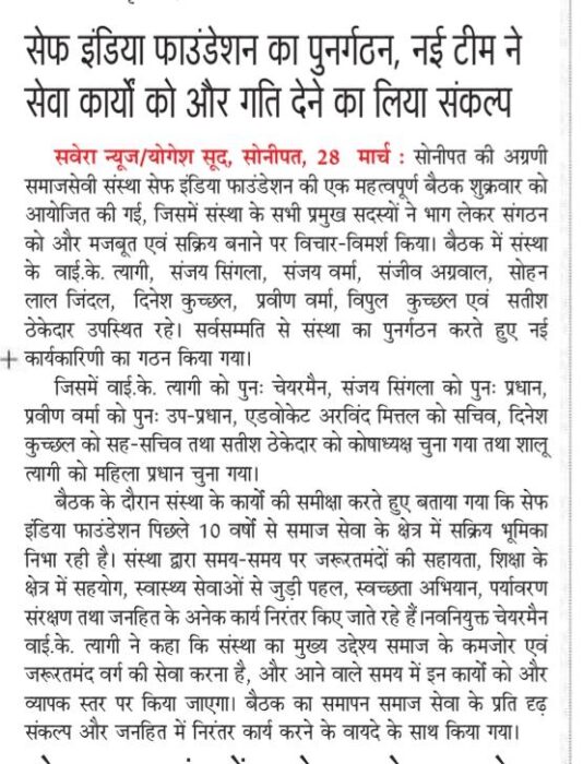 सेफ इंडिया फाउंडेशन का हुआ पुनर्गठन